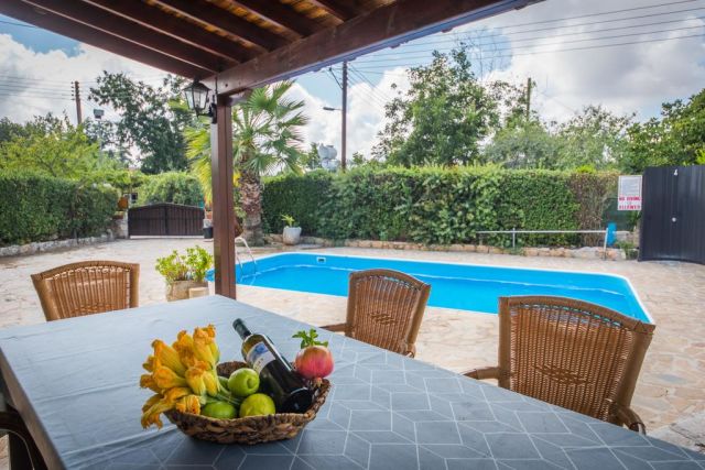 De villa heeft een groot overdekt terras met zitje, eigen zwembad voor een verfrissende duik, en genoeg ligstoelen en parasols om daarna te ontspannen en te genieten van de Cypriotische zon. Tevens is er een gezellige barbecueplek. Kortom dit wordt heerlijk relaxen en genieten met het hele gezin.