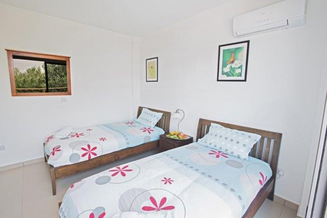 Eén slaapkamer met een tweepersoonsbed en een aparte badkamer met een bad/ douchecombinatie en toilet is gelegen op de begane grond. De marmeren trap leidt naar de eerste verdieping waar de andere twee slaapkamers liggen. De ouderslaapkamer is voorzien van een tweepersoonsbed, een heerlijk balkon met een geweldig uitzicht op de zee en een en-suite badkamer met douche en toilet. De derde slaapkamer is uitgerust met twee eenpersoonsbedden. De badkamer heeft een bad/ douchecombinatie en een toilet. Vanuit de eerste etage heeft u ook toegang tot het dakterras.