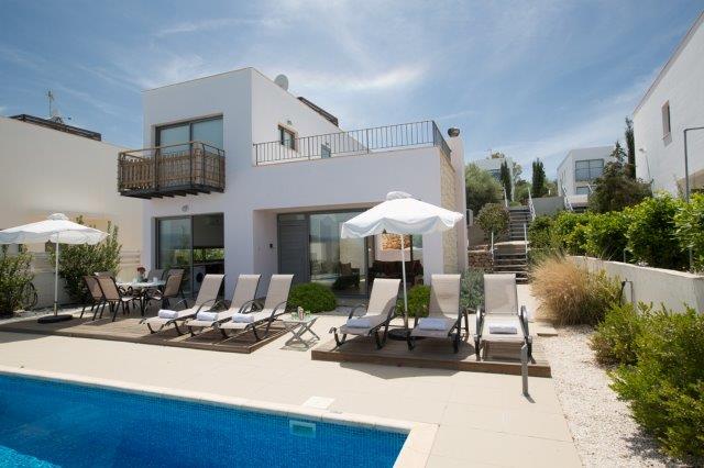 Deze villa ligt in het midden van het kleine straatje. Vanuit de woonkamer loopt u zo de zonnige tuin in met het privé zwembad (8 m x 4 m) en een verscheidenheid van planten en bomen. Vanuit de tuin heeft u prachtig zeezicht. Er is voldoende ruimte om te zonnebaden en buiten te dineren.