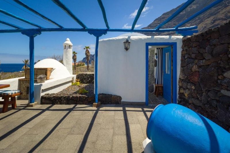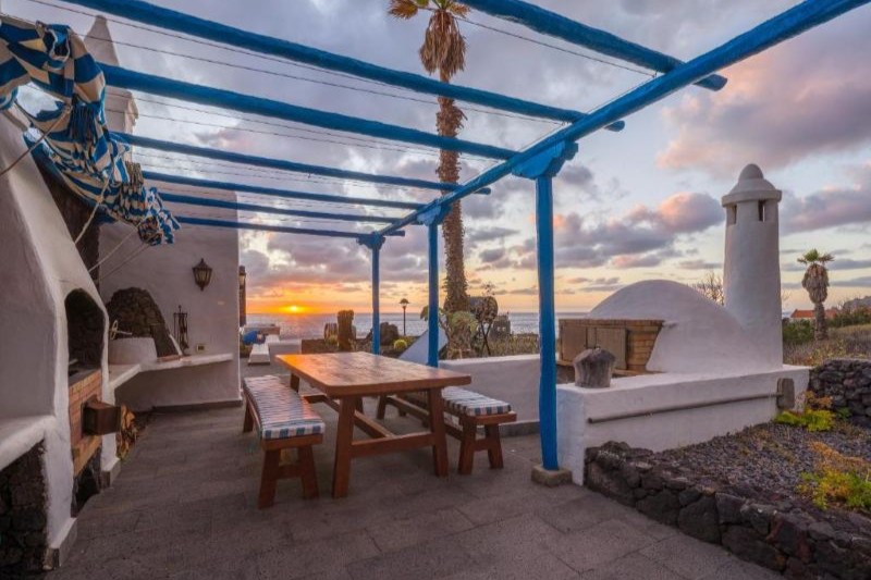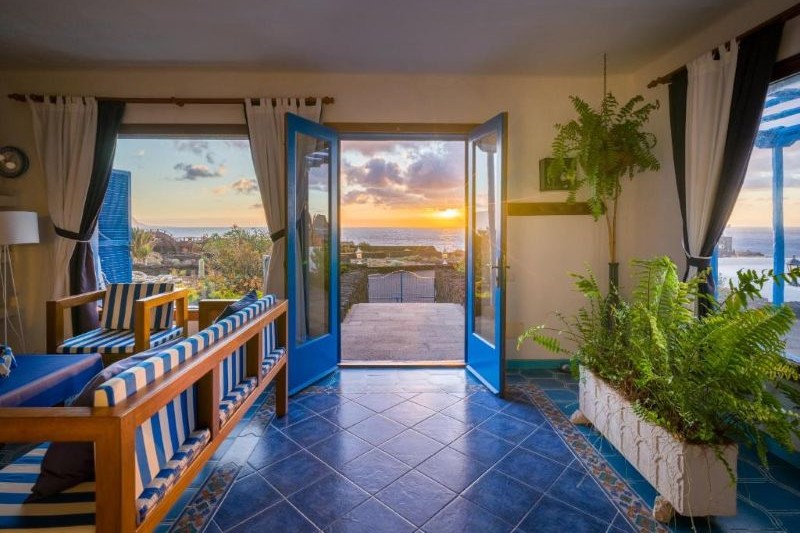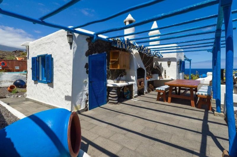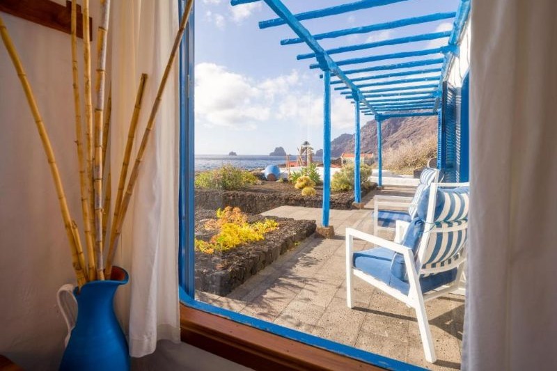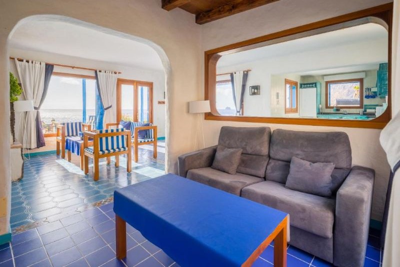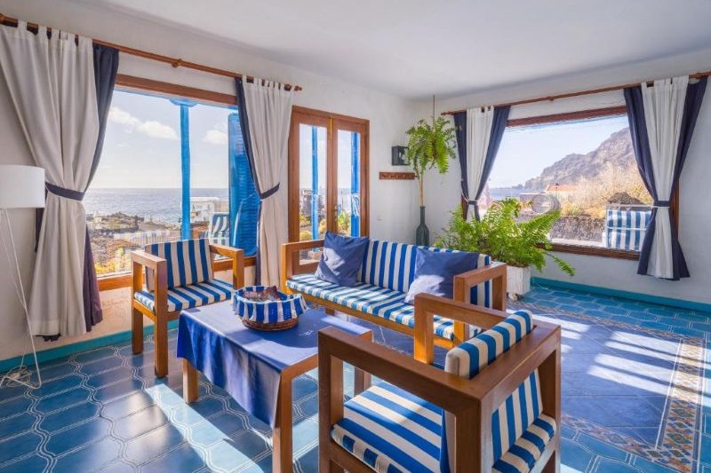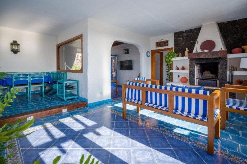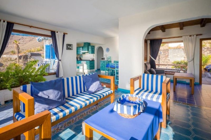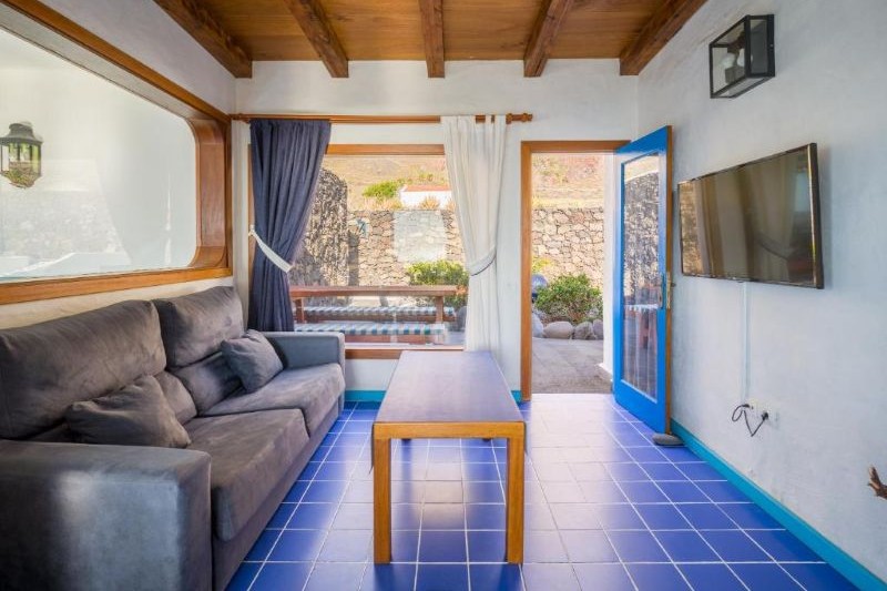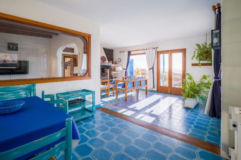 Villa Juan is een ruime gelijkvloerse villa, geschikt voor maximaal acht gasten, en ligt op een unieke locatie direct aan zee in Frontera op El Hierro. Via de entree komt u binnen in de royale woonkamer, een lichte en sfeervolle ruimte met een prachtig uitzicht op zee. Grote ramen laten veel daglicht binnen en zorgen ervoor dat de oceaan altijd dichtbij voelt. De blauwe details, karaktervolle tegelvloer en houten accenten geven de ruimte een warme en typisch eilandse sfeer.