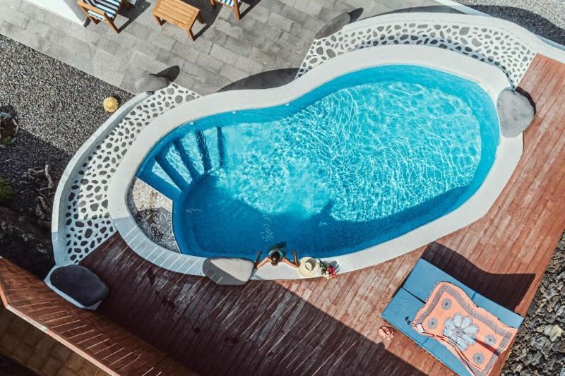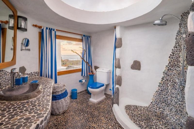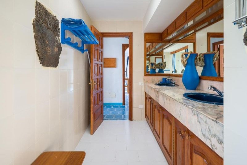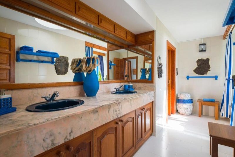 Er zijn twee badkamers aanwezig. In de villa vindt u een ruime badkamer met dubbele wastafel, toilet en douche. Daarnaast is er een bijzondere tweede badkamer die van buitenaf bereikbaar is. Deze badkamer is volledig ontworpen in de stijl van César Manrique, met natuurlijke vormen, stenen details en een unieke sfeer die perfect past bij de omgeving. Ook hier vindt u een wastafel, toilet en douche, waarbij u dankzij de open en bijzondere opzet bijna het gevoel heeft alsof u onder de sterrenhemel doucht.