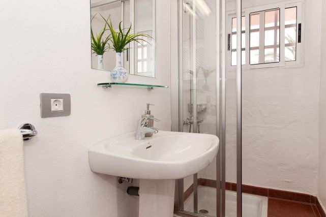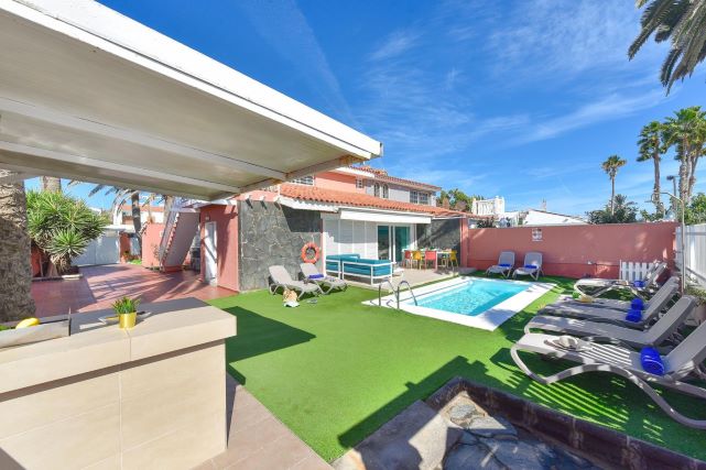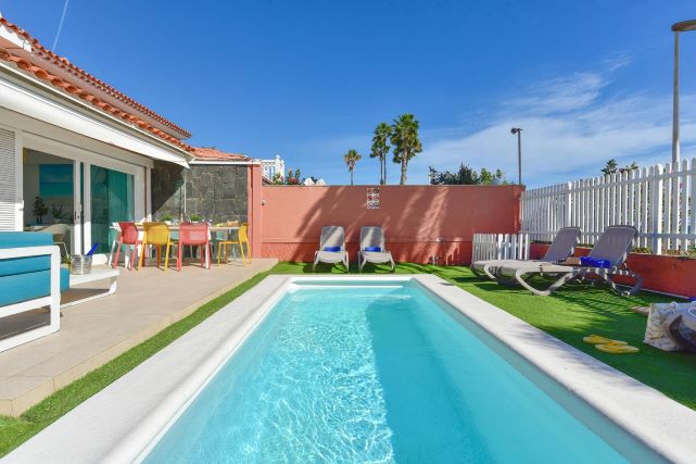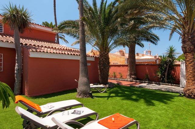 Vanuit de woonkamer kunt u via de openslaande deuren naar het terras. Het terras is voorzien van een zonnescherm zodat u in de schaduw kunt relaxen en eten. Op het gras staan een aantal ligbedden om heerlijk te genieten van de Canarische warmte. Daarnaast heeft u natuurlijk de beschikking over een privé zwembad (4,50m x 2m) en buitendouche. Heerlijk in de ochtend een verfrissende duik neme!. Voor het diner kunt u gebruik maken van de barbecue en de buitenkeuken: genieten tijdens de ondergaande zon.