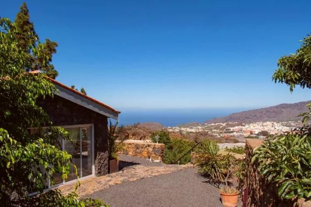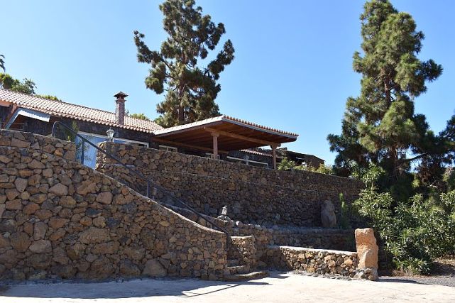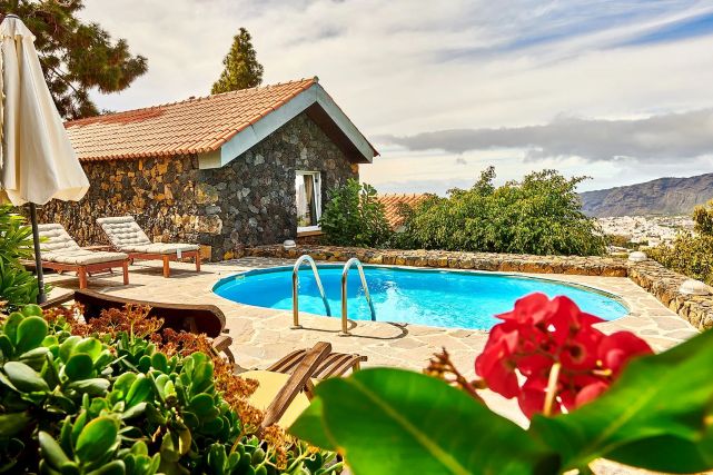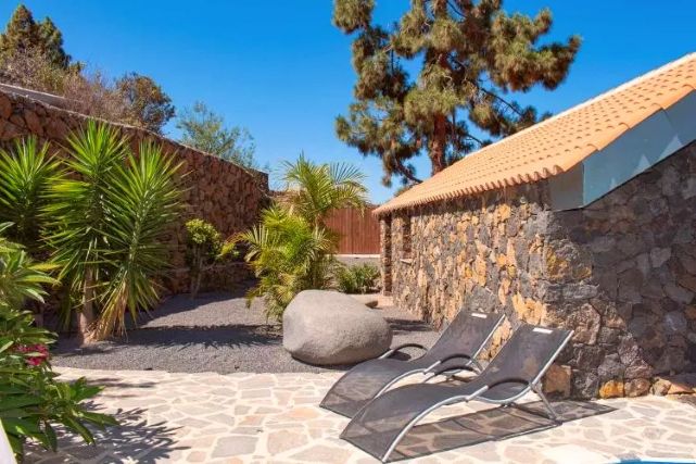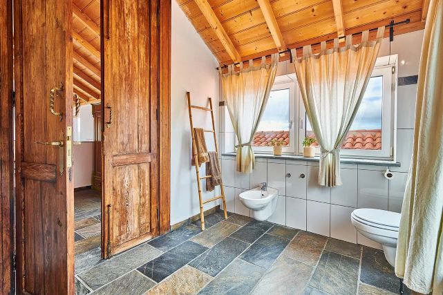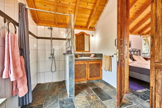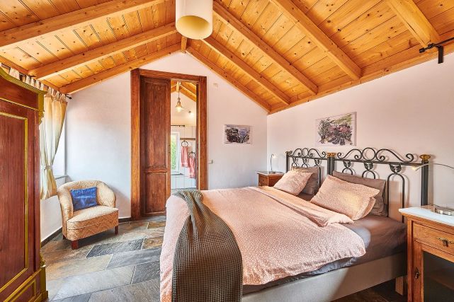 Vanuit deze slaapkamer heeft u direct toegang tot het terras achter het huis en het knusse ronde privé zwembad, een fijne plek om af te koelen en te genieten van de rust en privacy. Het zwembad is ook bereikbaar via een buitentrap met ongeveer vijftien treden, waardoor de verschillende niveaus van de villa op een natuurlijke manier met elkaar verbonden zijn.