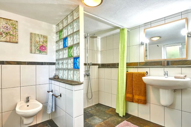 Op de bovenverdieping vindt u de tweede slaapkamer, eveneens ingericht met twee eenpersoonsbedden die zijn opgemaakt als tweepersoonsbed en een kledingkast. De eigen badkamer beschikt over een wastafel, toilet en douche.