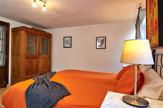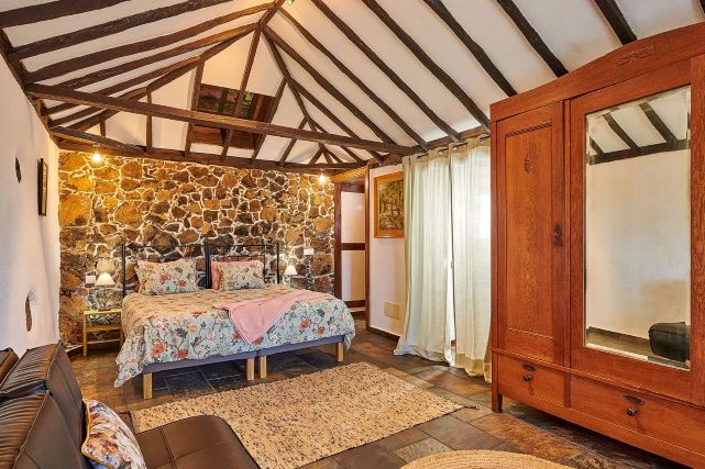 De villa beschikt over twee slaapkamers. Eén slaapkamer heeft een authentieke uitstraling met mooie elementen zoals natuurstenen muren en een warme, karaktervolle sfeer. Deze slaapkamer is ingericht met twee eenpersoonsbedden die zijn opgemaakt als een tweepersoonsbed, een kledingkast en een zitbank. De tweede slaapkamer is ruim en praktisch ingericht en beschikt over twee eenpersoonsbedden en een kledingkast.