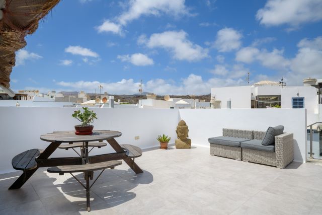 Het dakterras is een pareltje! Het is ruim met maar liefst 60m2 en is voorzien van tuinmeubilair, ligbedden en een Balinese hut waar u heerlijk kunt relaxen en genieten van het uitzicht op zee.
