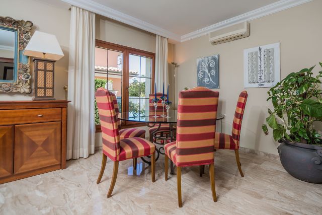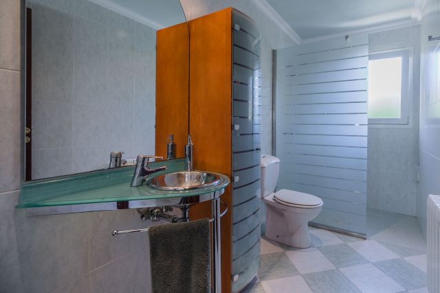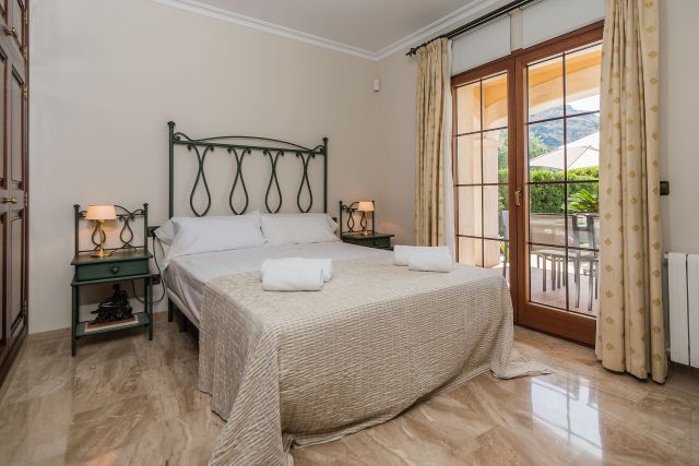 De villa beschikt over vier slaapkamers. Op de begane grond bevindt zich een tweepersoonsslaapkamer met een bed van 1,50 x 2,10 meter en directe toegang tot het terras. Aangrenzend vindt u een badkamer met douche, wastafel, toilet en een föhn. Op de eerste verdieping zijn er twee tweepersoonsslaapkamers (bedden 1,50 x 2,00 en 1,35 x 2,00 meter) en een slaapkamer met twee eenpersoonsbedden (0,90 x 2,00 meter). Er zijn twee badkamers op deze verdieping, waarvan één en suite, beide met douche, wastafel en toilet. Daarnaast is er een extra gastentoilet op de begane grond. Op de eerste verdieping is bovendien airconditioning aanwezig in de hal voor de slaapkamers.