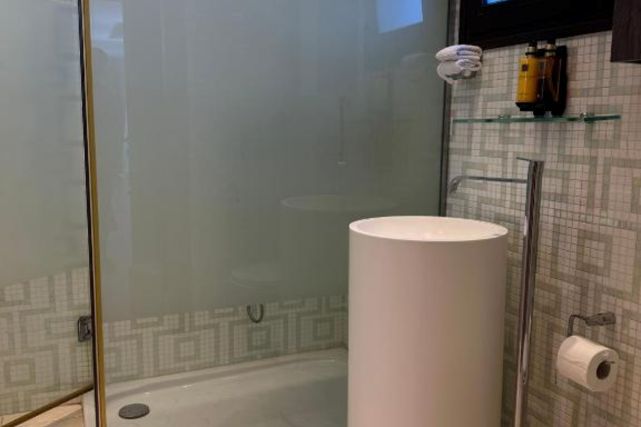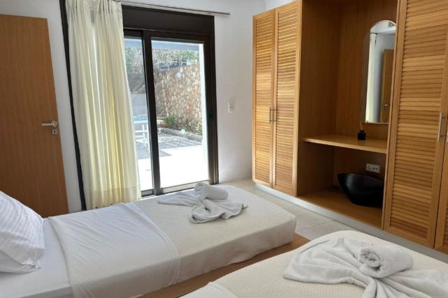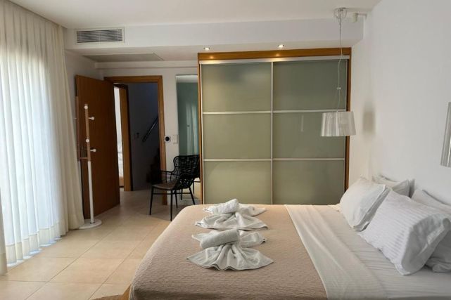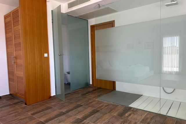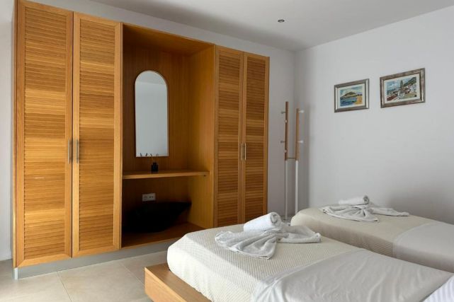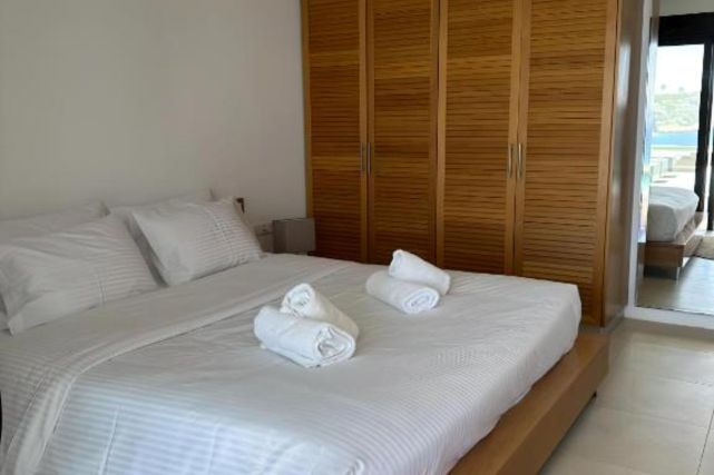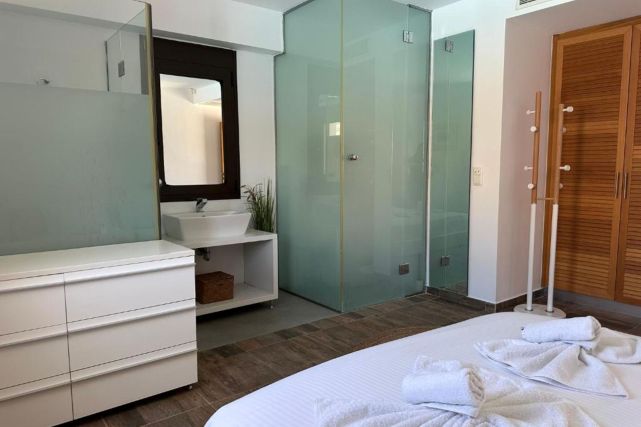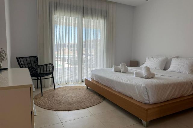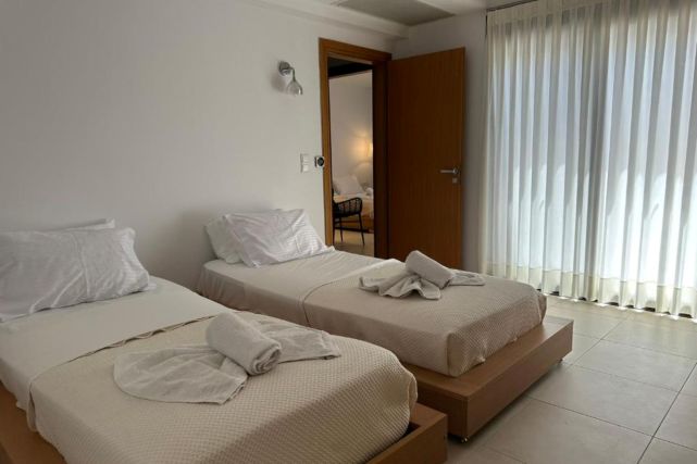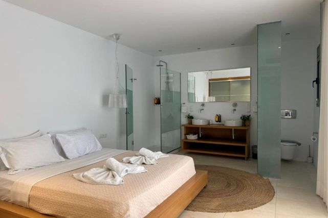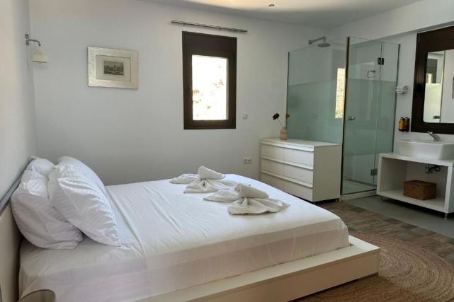 De villa beschikt over vijf slaapkamers, allemaal voorzien van airconditioning en ingericht voor een comfortabel verblijf. Op de begane grond vindt u een slaapkamer met een tweepersoonsbed en een eigen sanitaire ruimte met wastafel, douche, toilet en föhn, die open in de kamer is geïntegreerd.